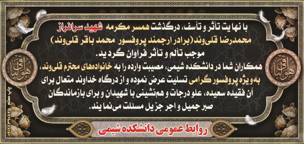با نهایت تأثر و تأسف، خبر درگذشت همسر مکرمه شهید سرافراز، محمد رضا قلیوند (برادر ارجمند پرفسور قلیوند) موجب تألم و تأثر فراوان گردید.این بانوی فداکار و صبور که پس از عمری مجاهدت و حفظ میراث گرانبهای شهادت، به همسر شهیدش پیوست، اکنون در جوار رحمت واسعه الهی و در محضر اولیاء و صلحاء مأوا گزیده است.همکاران شما در دانشکده شیمی، مصیبت وارده را به خانوادههای محترم قلیوند، به ویژه پروفسور گرامی تسلیت عرض نموده و از درگاه خداوند متعال برای آن فقیده سعیده، علو درجات و همنشینی با شهیدان، و برای بازماندگان صبر جمیل و اجر جزیل مسئلت مینماید.