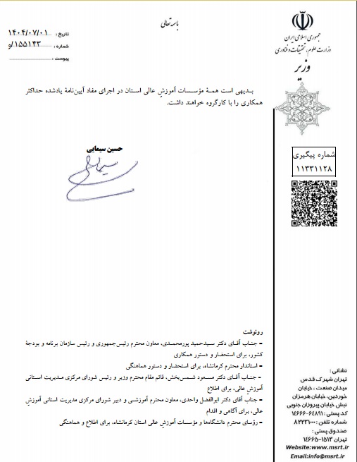 در اجرای مصوبه شماره ۷۴۱۸/۹۵/دش مورخ 1395/04/27 شورای عالی انقلاب فرهنگی و نیز مصوبه جلسه ۱۳۱ ستاد راهبری اجرای نقشه جامع علمی کشور (ابلاغیه ۵۷۱۱/۹۹/دش مورخ ۳۰/۰۴/۱۳۹۹ دبیر محترم شورای عالی انقلاب فرهنگی)، بهمنظور تمرکززدایی و شبکهسازی علمی، همافزایی مؤسسات آموزش عالی واقع در یک استان، مشارکت هرچه بیشتر مؤسسات در تصمیمگیریها و تصمیمسازیهای آموزش عالی، متناسبسازی و متوازن کردن توسعه مؤسسات، کاهش بوروکراسی ناشی از تمرکز تصمیمگیریها و ایجاد هماهنگی و تبادل تجربیات میان ساختارهای آموزش عالی، همچنین وفق مفاد «ماده ۱ آییننامه مدیریت استانی دانشگاهها و مؤسسات آموزش عالی» (ابلاغیه 11/131027مورخ 1404/06/12) و به استناد مصوبه جلسه 1404/06/16 شورای مرکزی مدیریت استانی آموزش عالی، جناب عالی در مقام رئیس دانشگاه معین استان کرمانشاه و نماینده وزیر علوم، تحقیقات و فناوری در آن استان منصوب میشوید.