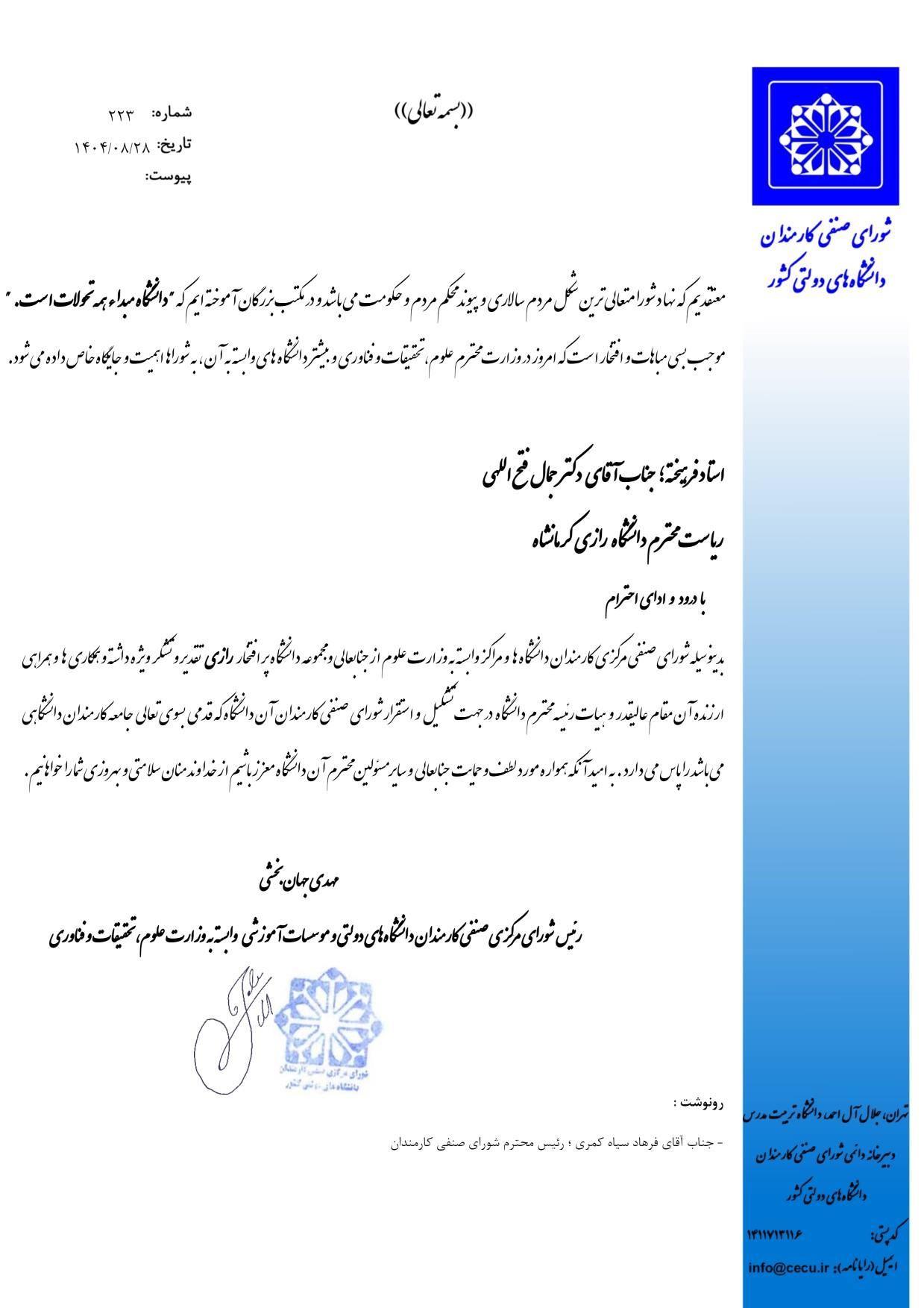 بدین وسیله شورای صنفی مرکزی کارمندان دانشگاهها و مراکز وابسته به وزارت علوم از جنابعالی و مجموعه دانشگاه پرافتخار رازی تقدیر و تشکر ویژه داشته و همکاریها و همراهی ارزنده آن مقام عالیقدر و هیئت رئیسه محترم دانشگاه در جهت تشکیل و استقرار شورای صنفی کارمندان آن دانشگاه که قدمی به سوی تعالی جامعه کارمندان دانشگاهی میباشد را پاس میدارد. به امید آنکه همواره مورد لطف و حمایت جنابعالی و سایر مسئولین محترم آن دانشگاه معزز باشیم از خداوند منان سلامتی و بهروزی شما را خواهانیم.